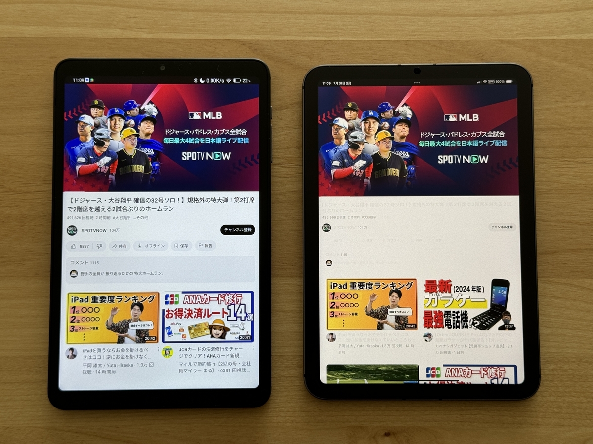 次はYouTubeを横向きにして全画面表示した時の比較です。ここで始めてALLDOCUBEの横長画面が活きまして、下のiPad mini 6よりも大きく画面いっぱいに映っていると思います。iPadは上下の黒帯が大きくなっていますね。